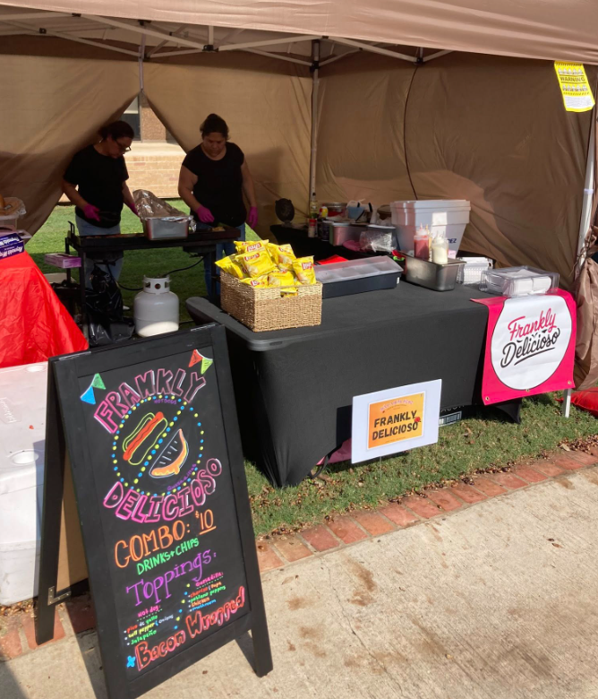 Frankly Delicioso -We sell bacon wrapped hotdogs, gorditas and Frito pie. Drinks as well.