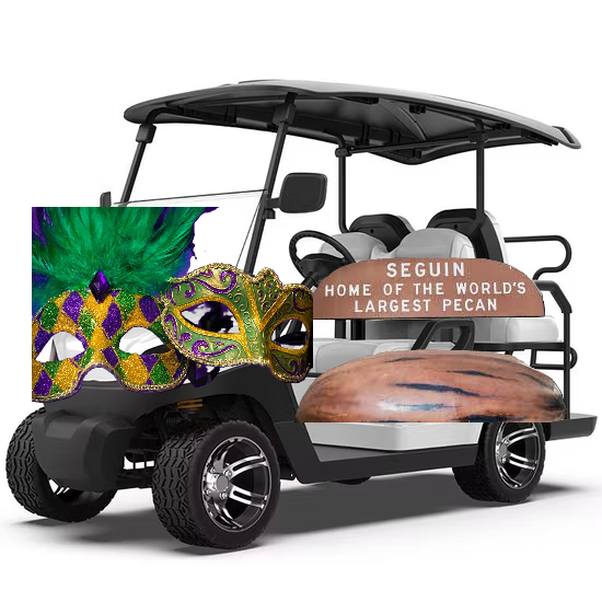 Mardi Gras Seguin 2026 welcomes all neighboring cities to join our afternoon parade with the opportunity to ride in one of our Golf Carts. Your Golf Cart can be decorated, representing your city with your choice of four riders handing out beads, doubloons, and candy to spectators.